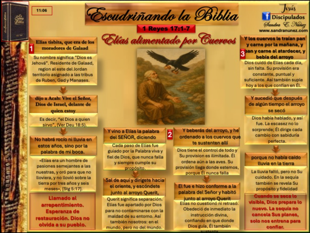 Dios diseñó cada detalle. Nada faltó. Elías no tenía abundancia, pero tampoco carecía. Aprendió a vivir por fe, recibiendo de Dios cada día. Lo mismo hace el Señor con nosotros hoy. Cuando caminamos en obediencia, Él se encarga de lo demás.