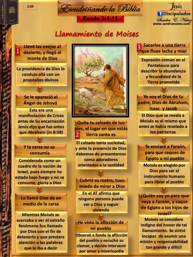 El Dios que se revela a Moisés es el mismo que antes se había revelado a los patriarcas y hace el “llamamiento a Moisés” «Ven, por tanto, ahora, y te enviaré a Faraón, para que saques de Egipto a mi pueblo, los hijos de Israel», [Ex 3:10], Moisés es elegido por Dios para ser el instrumento humano para librar al pueblo. Sin embargo, Moisés se consideraba indigno del honor de tal llamamiento. Se sintió incapaz de asumir una misión y responsabilidad tan grande y difícil; y ante ese hecho Dios le dice estas bellas palabras: “Vé, porque yo estaré contigo [Ex 3:12].